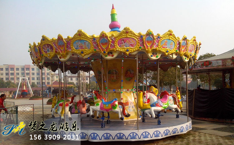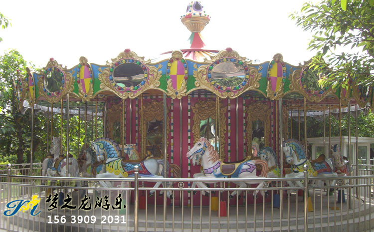 豪華旋轉木馬是夢之龍開發研制的新款游樂設施。該設備既能繞垂直主軸旋轉,又能上下起伏的游樂機械。屬于下傳動、設計新穎、機構獨特、造型美觀。下面是夢之龍豪華旋轉木馬使